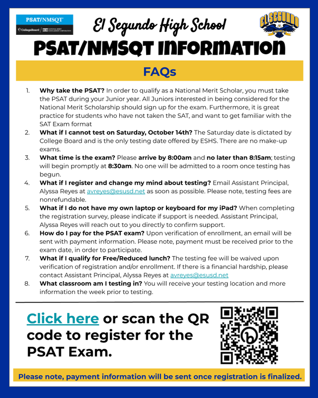 *UPDATE* Registration has been extended until Monday, September 25th and is now available for 10th grade students! The cost of the exam is $25 and is non-refundable. Once registered, please submit payment (Cash or Check) to Ms. Hernandez in the main office no later than Friday, September 29th.