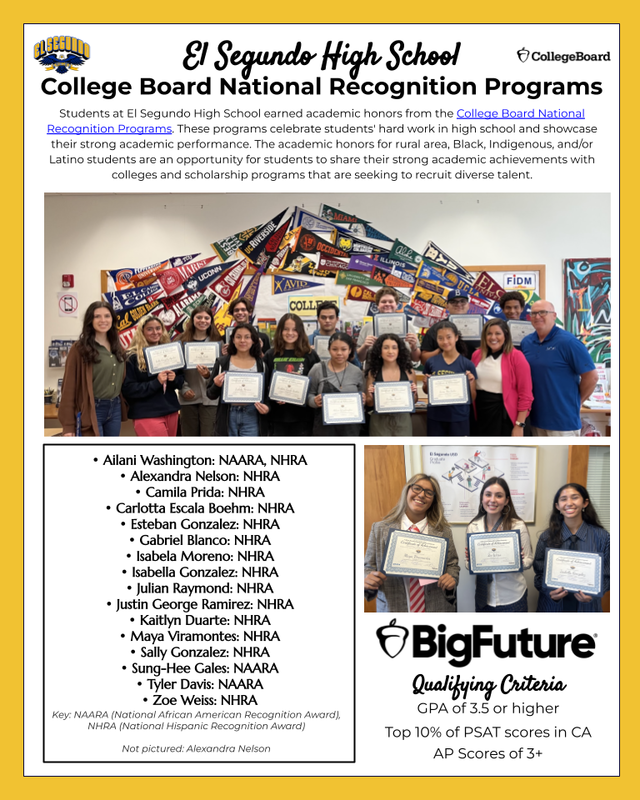 Please Join Us in Celebrating ESHS Students who received recognition from College Board's Big Future Program! We are so proud! Please click on the image to learn more about this recognition.
